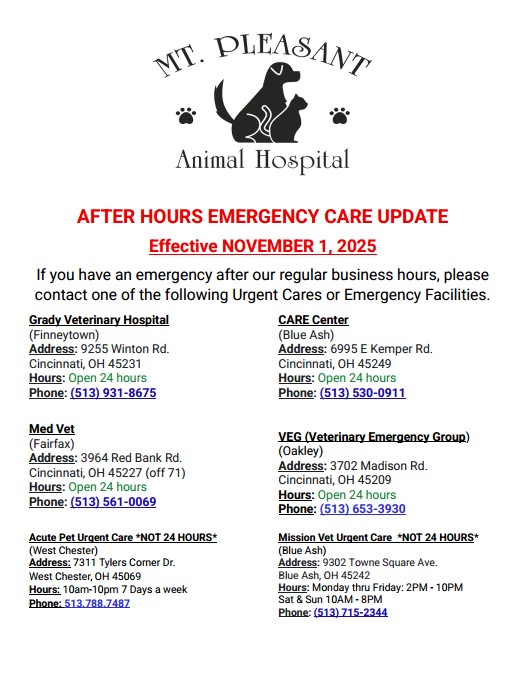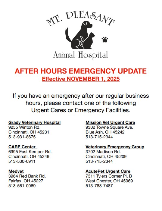 If you have any questions about how we can care for your pet, please don't hesitate to call us at (513) 829-3830. Thank you!